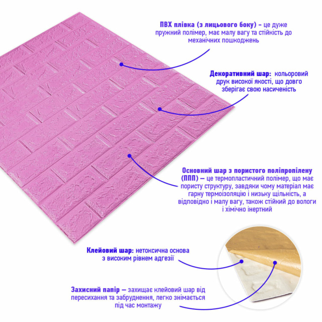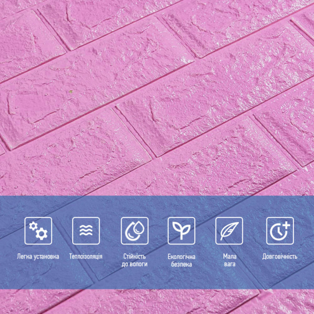 3D панелі самоклеючі – декоративне покриття для стін, виконане з легкого та міцного матеріалу – пористого поліпропілену (ППП). Основна особливість – рельєфний малюнок у вигляді цегли у широкому різноманітті кольорів та наявність клейового шару, що дозволяє встановити панелі без необхідності застосування додаткових матеріалів.