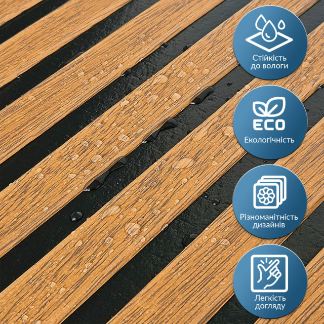 - Стійкість до води та хімічних речовин: пористий поліпропілен має гарну стійкість до вологи, це дає можливість застосовувати його у приміщеннях з підвищеною вологістю, а завдяки захисній ПВХ плівці, панель можна мити побутовими миючими засобами (без використання щітки з високою абразивною здатністю).